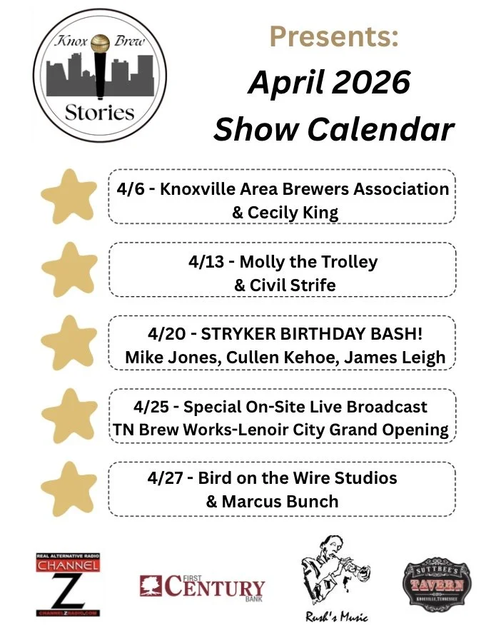 Join us in person live from Suttree’s High Gravity Tavern (409 S Gay St) or stream live on Channel Z Radio (KnoxBrewStories.com/radio) Mondays at 6PM!